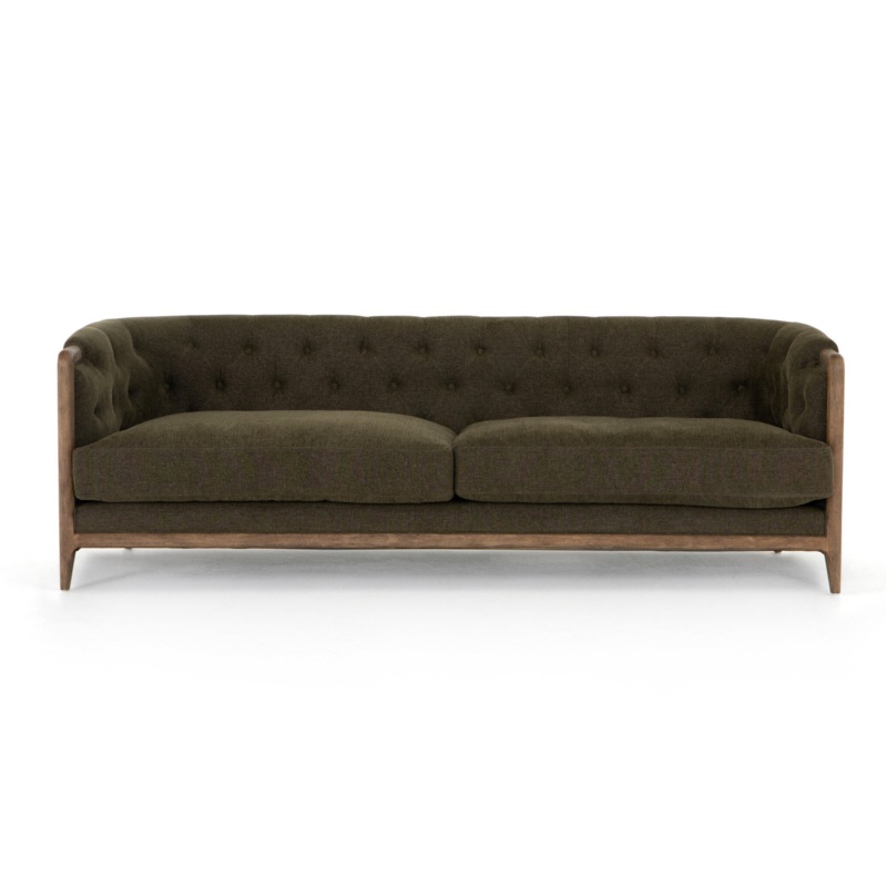 Dress the room with Parisian vibes. With traditional button tufting and classic rolled arms, feather-blend seating is upholstered in a deep, earthy olive performance fabric for a warm, regal look, with exposed parawood framing for a natural touch.