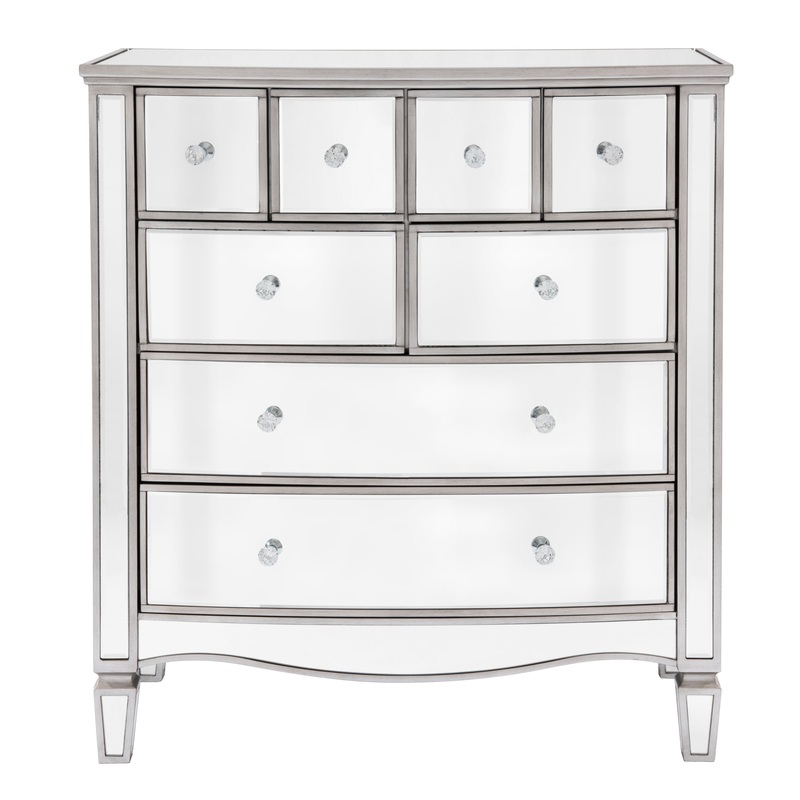 Elegantly made this 8 drawer merchant chest is crafted in a clean, detailed design with a beautiful glass mirrored finish to provide a sense of space and light even in the dullest of rooms.