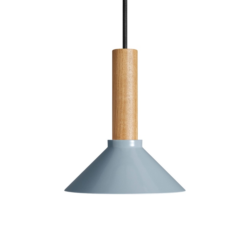 A genial powder-coated steel shade hugs an elegant wood stem to create a joyful juxtaposition of materials. Designed to let light shine through the top of the shade for a warm touch and added delight. Three sizes and multiple glorious colors to choose from. Mix and match as you please. Mounts from the ceiling.
