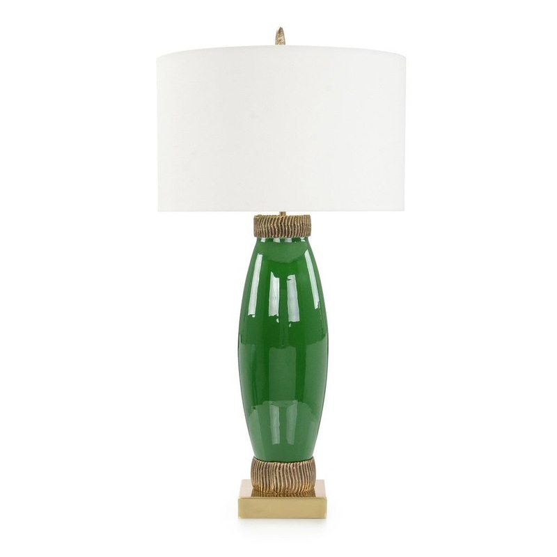 Description: The Camden Aurelian Lamp features a stunning body of green glass with alluring curvature, held in place by gorgeous bands of brass in an antiqued finish. The bands, featuring intricate textural detail, provide the piece with a dignified look that imbues an interior space with an air of gravitas. The piece gently rests atop a square brass base with a polished finish that matches the finial, playfully contrasting the darker metallic tones of this stunning turnkey lamp.