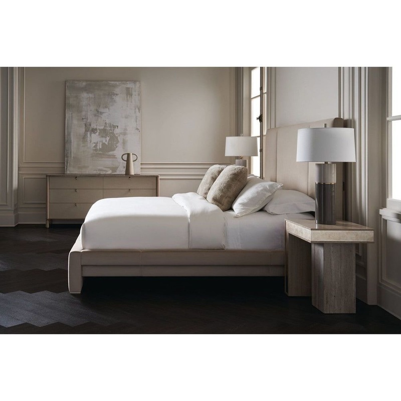 Light tones and organic textures in perfect balance exude a refined modern elegance. Soft-to-touch, vinyl wrapped drawers are complemented by Silver Platano wood veneers and a polished travertine stone top. Metal accents and a base in Lucent Bronze add warmth and subtle contrast to its calming, clean-lined form.