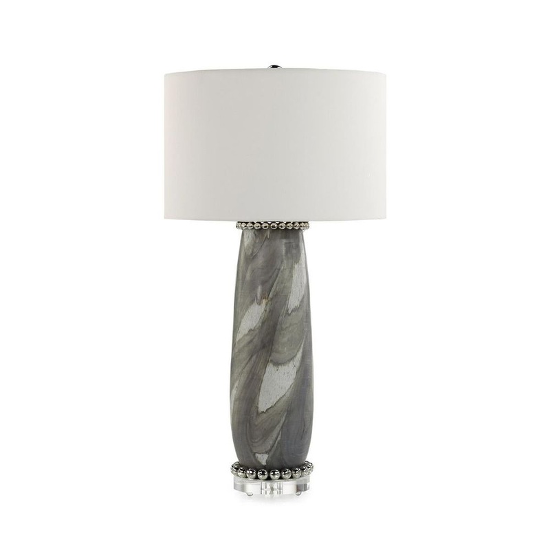 The Shadow Table Lamp is crafted from glass, showcasing sweeping flourishes of black and white shades. Two strands of beads in a Polished Nickel finish line the body, matched by the neck hardware and ball finial. This table lamp with a three-way switch features a round base of clear acrylic, contributing transparent tones to elevate the look.