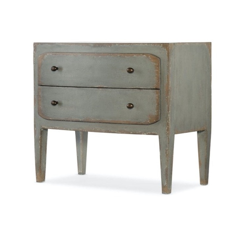 The Estoril Nightstand is inspired by the old farmhouse furniture found in the countryside of France or Italy. The worn finish gives the appearance of a family heirloom that has been well-loved and passed along through generations. The distressed detail includes wormholes, rasping, multi-layer rub through and emulsion. Burnished brass hardware is a stunning contrast against the black finished wood.