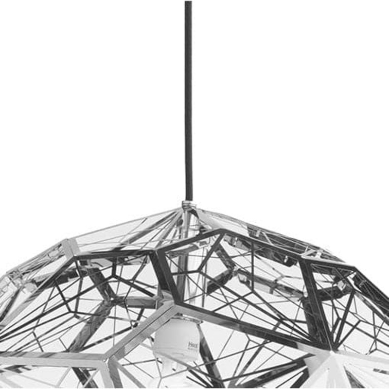 This bold hanging pendant is sure to make a statement in any room. Inspired by the angles of mathematics, the sphere of the pendant is composed of an irregular pentagon shape repeated around the entire body that casts stunning geometric shadows when illuminated. Created through digital photo acid-etching this unique open-patterned stainless steel lamp will look great in modern and contemporary spaces alike. Available in silver or gold finish.