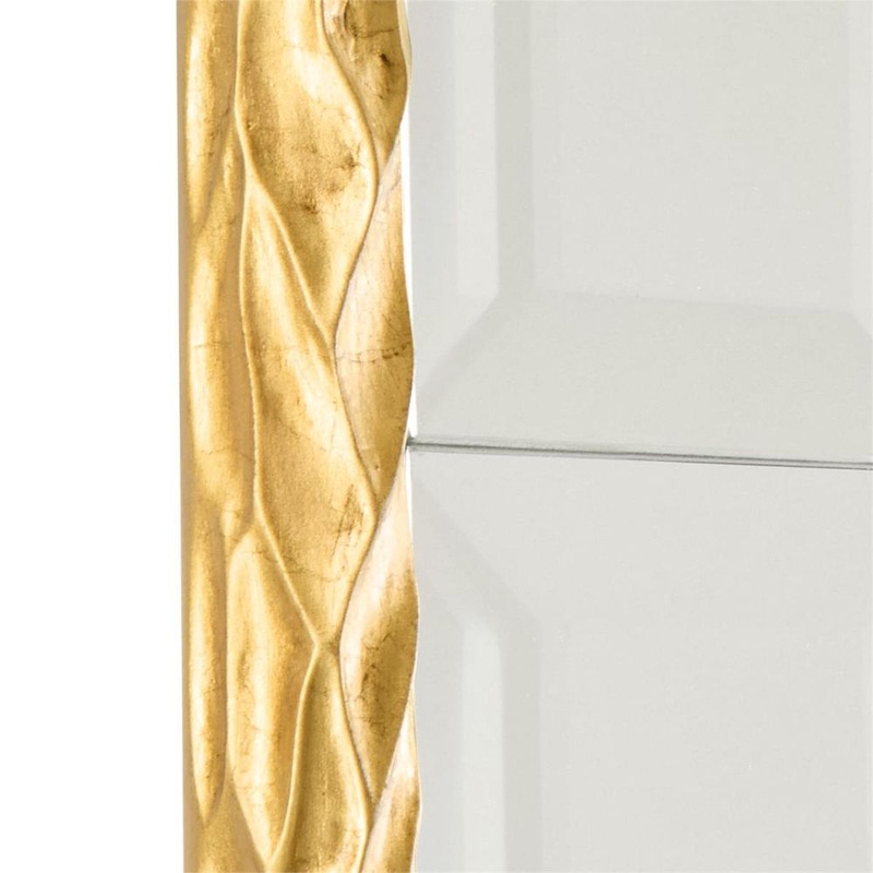 The Eterna Mirror balances minimalist design with refined detailing. A pane of beveled glass showcases a sleek grid-like pattern that frames the central mirror, giving the design a stately appearance. The piece is set within a textural beech wood frame finished in Exotic Gold, elevating the piece with an elegant touch. Designed for secure installation, it features French cleat hangers on the back.