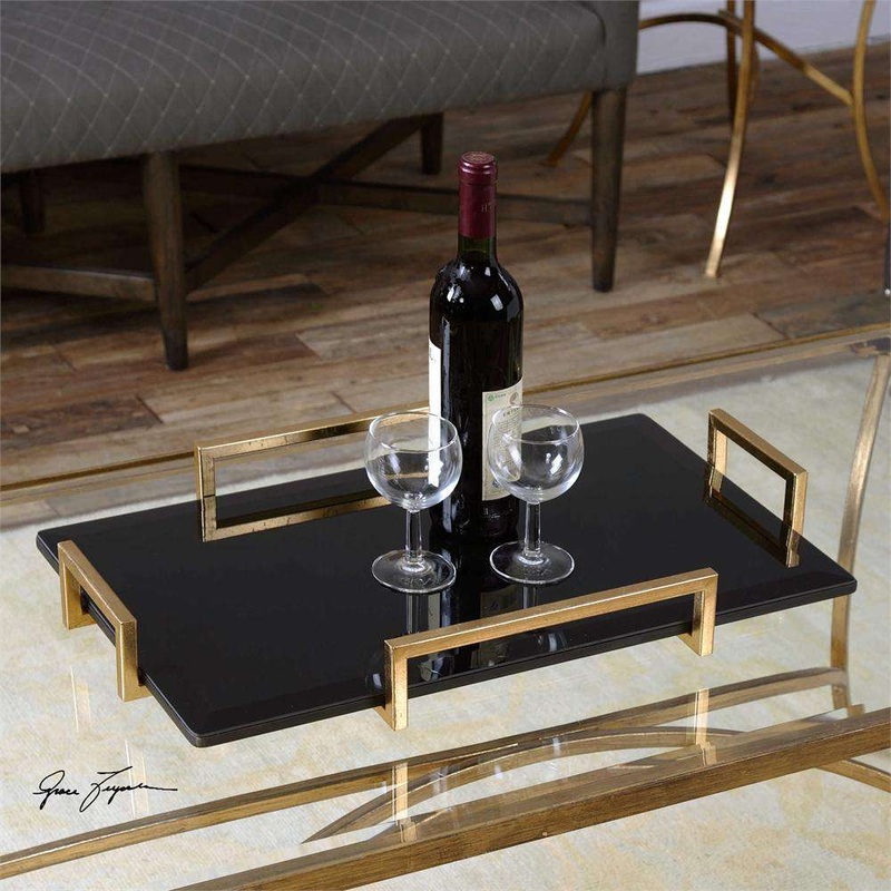 Sophisticated, black beveled glass tray with lightly antiqued gold leaf handles.