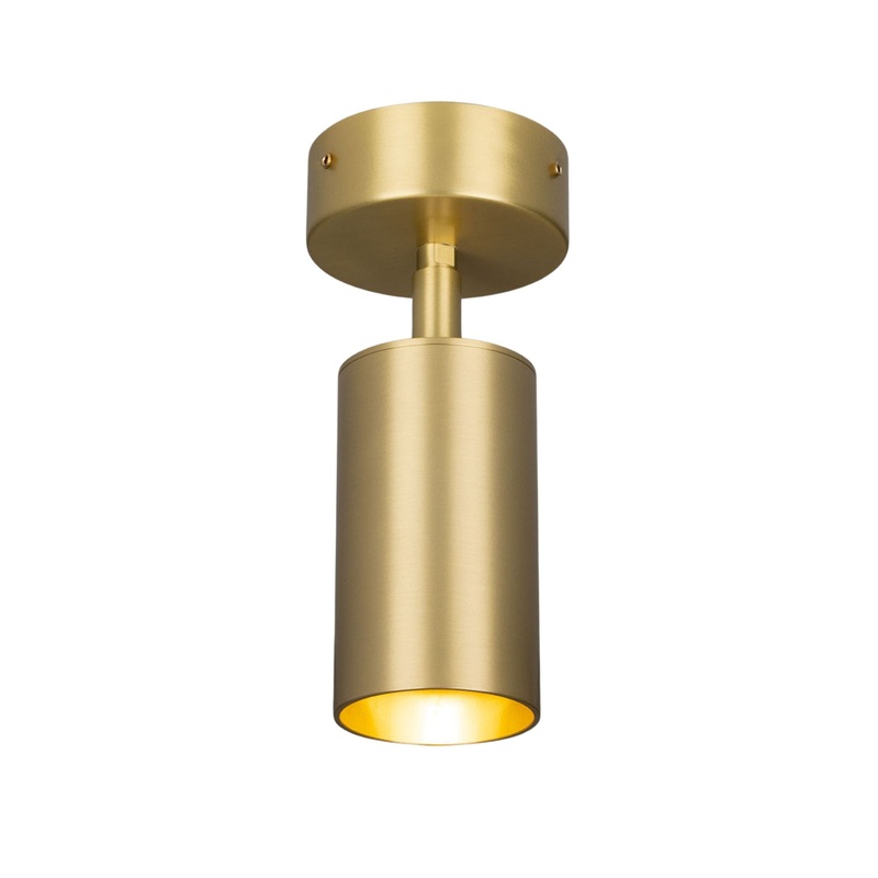 A short brass sleeve descends from its ceiling rose, connecting to a cylindrical brass body. This cylindrical brass body can be rotated in any direction.