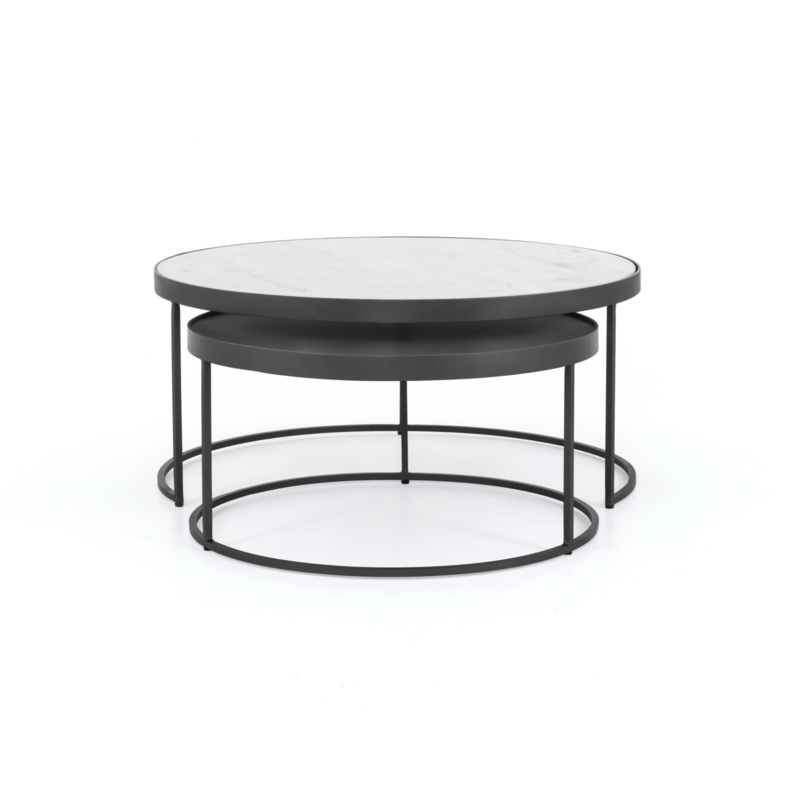 Stacked and structured, slim iron lends edge to the sophistication of polished white marble. Nesting feature for compact functionality and modern, adaptable appeal. Large table measures 36″W x 36″D x 16″H. Small table measures 28″W x 28″D x “14”H.