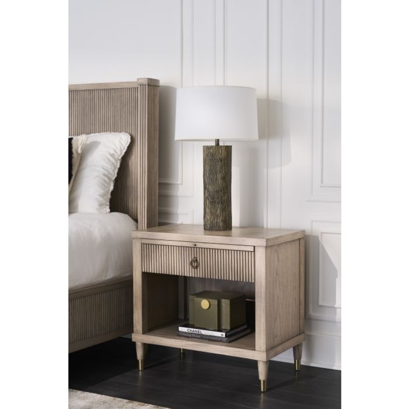 - Features one drawer with open compartment for storage and one pull out shelf. Brushed Brass hardware and ferrules.