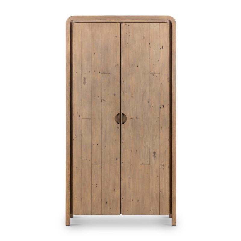 Simple and natural-spirited. Light-finished reclaimed woods shape stately cabinetry with rounded corners for a softened look. Inside, generous space and adjustable shelving fuse for ample storage ideal in any room.