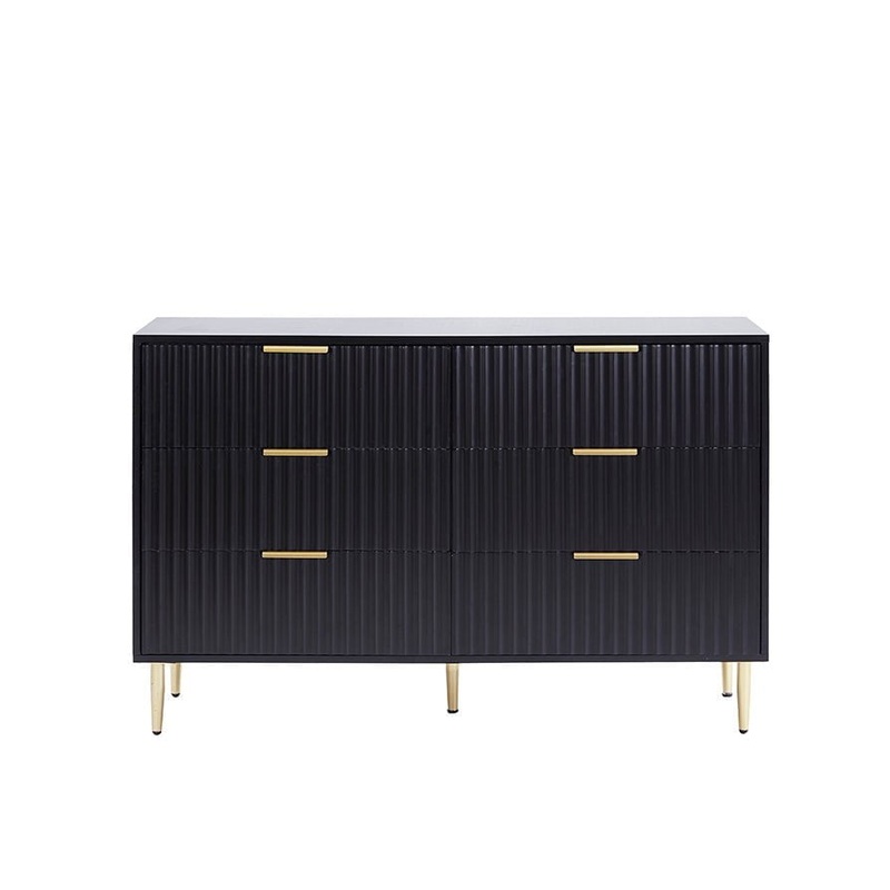 With smooth, curved lines and a symmetrical ridged design, let this chest of 6 drawers really set the tone for your home. Delivered flat packed, and with plenty of storage for all of your favourite things, this chest has metal drawer runners for ease and durability, and has a matte-black painted finish. It also features gold-effect legs, and cylindrical handles for a contemporary look and feel.