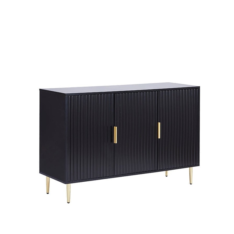 The Evie 3 Door Sideboard is a stunning blend of style and versatility. Delivered to your home flat packed, the Evie Sideboard is both durable and functional, providing the perfect place for all your home essentials. With a beautifully designed symmetrical ridged detail and smooth curved lines, it also has a matte painted finish in black and gold-effect legs and handles for a striking colour contrast.
