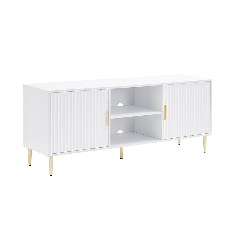 Delivered to your home fully flat packed, get ready to sit back and enjoy your favourite boxset in style. With a chic, symmetrical ridged design and smooth curved lines, its crafted with a timeless matte finish in classic warm white, and features gold-effect handles and legs for a striking colour contrast. Measuring 140cm, the Evie TV stand has 2 spacious side cabinets, and a handy central shelf – perfect for your cables, TV equipment and other electronics.