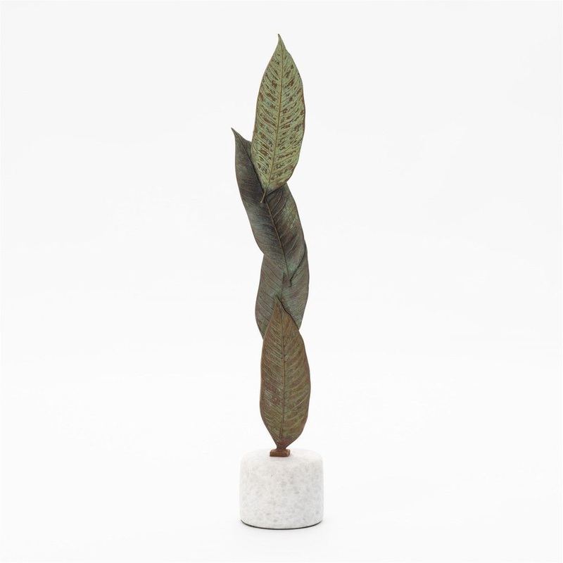 Description: This sculptural collection composed of leaves evokes the seasons of the year. Leaves are positioned overlapping to create a tall sculpture atop a circular white marble base. Use individually or as a grouping, these will accessorize your room with the look of an art gallery. Sold individually and available in 3 sizes.