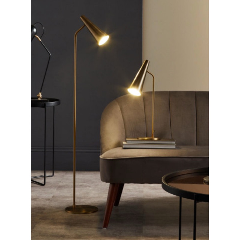 An elegantly simple task floor lamp with a beautiful elongated conical head, slim stem and foot. The finish is classic antique brass which will make the perfect sophisticated addition to any room.