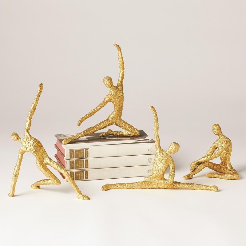 Description: Our Figural Male Dancer sculpture tells the story of overcoming feats of grace and strength. Made out of aluminum with a textured gold finish and a lacquer coating this piece fully captures the human spirit.