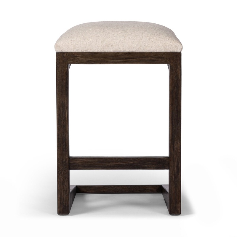 A stunner from every angle, this architecturally inspired stool features an angular base crafted from solid oak with two iron rods for added support and visual interest. Seat is upholstered in a linen/cotton/poly blend performance fabric with subtle texture throughout. Performance fabrics are specially created to withstand spills, stains, high traffic and wear, ensuring long-term comfort and unmatched durability.
