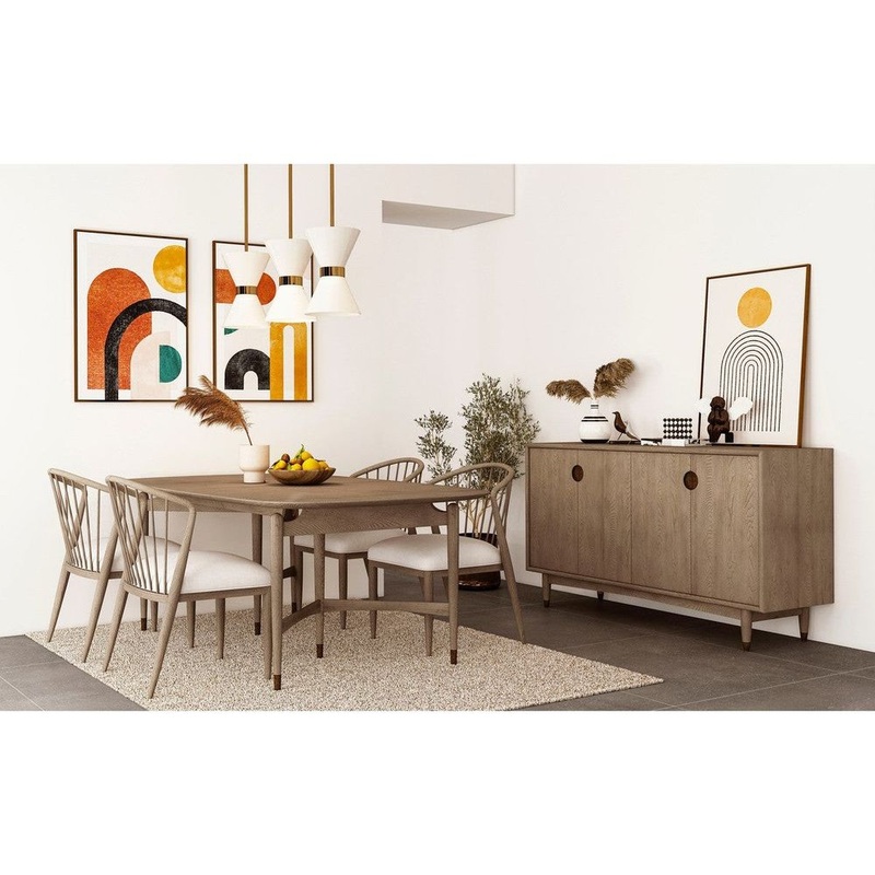 Description: Classic design looks fresh and clean in this modern take on a spindle back dining chair, with a slightly curved back for comfort. Soft grey elm veneer is perfectly complemented by neutral woven upholstery, for a look that’s warm and inviting.
