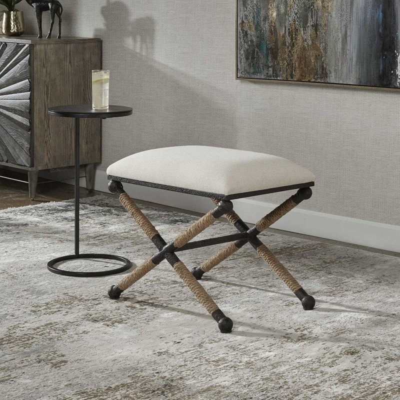 Rustic iron frame with a nautical touch, wrapped in natural fiber rope accents. The cushioned top is sturdy, and cotton in neutral oatmeal.