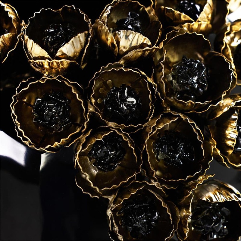 The Flame Blossom Vase is a stunning contemporary design statement elevated through natural motifs. Crafted from black glass, the vase features a faceted look that is complemented by an arrangement of stunning brass poppy flowers with glass embellishments.