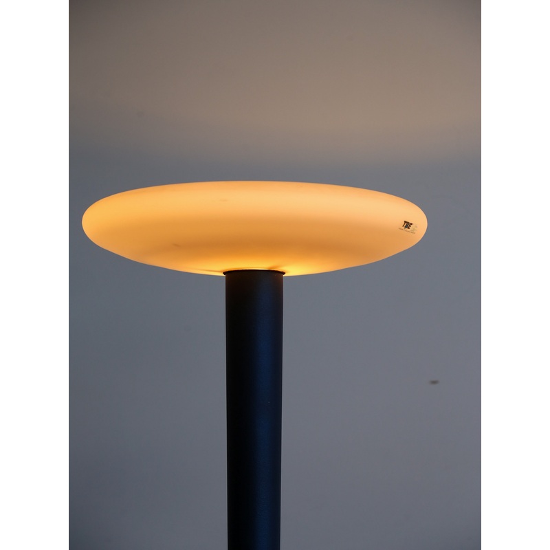 This lamp has a sleek and minimalist design with a slim, dark stand that supports a round, flat light fixture at the top. The light fixture appears to have a smooth, slightly domed shape, and it is of a different colour, a soft peach contrasting subtly with the dark stand.