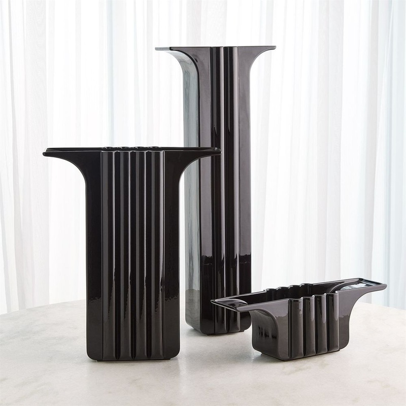 Description: The Flying Column Vases and Bowl showcase a sleek black gloss finish on slip-molded Portuguese ceramic. With their striking design, these pieces are bold statement accents that elevate any space.