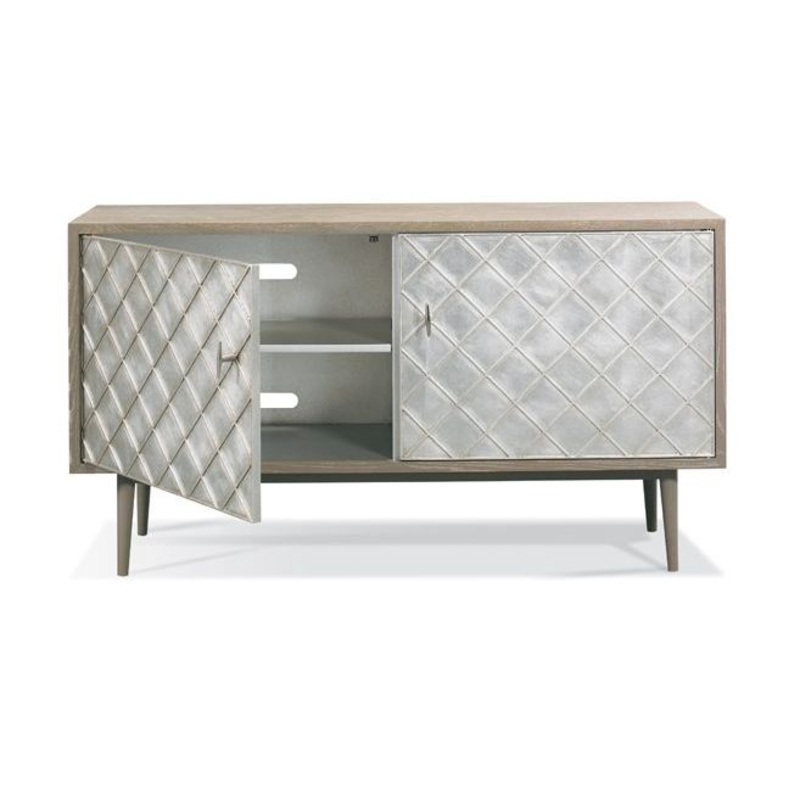Two door ash veneered cabinet in a smoke grey finish beautifully contrasted by silver leaf finished doors with a raised bead lattice overlay in a diamond pattern and simple mid-century hardware. The interior is petitioned into four equal sections and back-vented for electronic component use.
