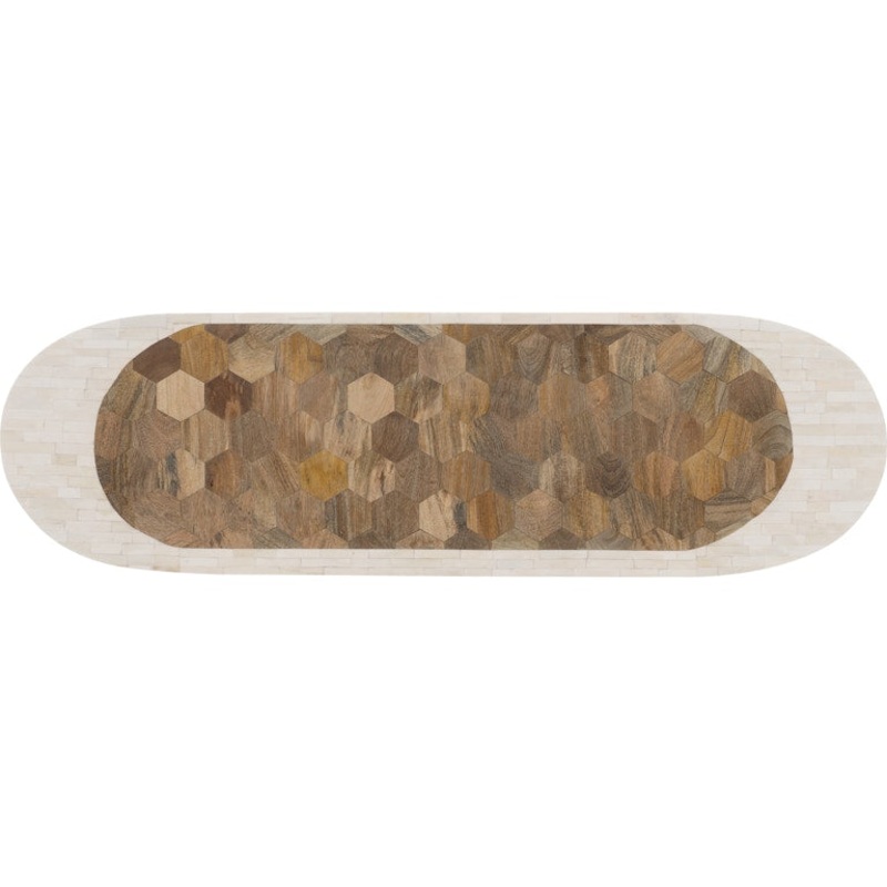 In an appealing oval shape and featuring an eclectic mix of natural materials and stylish surface interest, the Commerce & Market Console Table has a space saving 14 -inch depth and combines a lightly-scaled bronze metal base and stretchers with a two-tone natural bone inlay top in shades of cream and brown. Targeting the next generation of furniture buyers, Hooker Furniture unveils the Commerce & Market brand of accent and occasional pieces. Interior designers were front-of-mind when the Hooker Furniture team developed the dynamic palette and flexible applications of pieces within the new brand. The assortment of modern and updated designs presented within the brand include a dynamic variety of materials, styles and color palettes to inject a younger sensibility into the companys portfolio. Commerce & Market consists of pieces for the living room including a variety of accent tables, credenzas, consoles, chests, cabinets, etageres and bar carts. Globally sourced with design inspiration from around the world, the curated designs feature an eclectic assortment of materials including cast metals, bone inlay, marble, stone, travertine, painted glass, acacia solids, pecan, oak, mango wood, and walnut veneers in a variety of rich finishes.