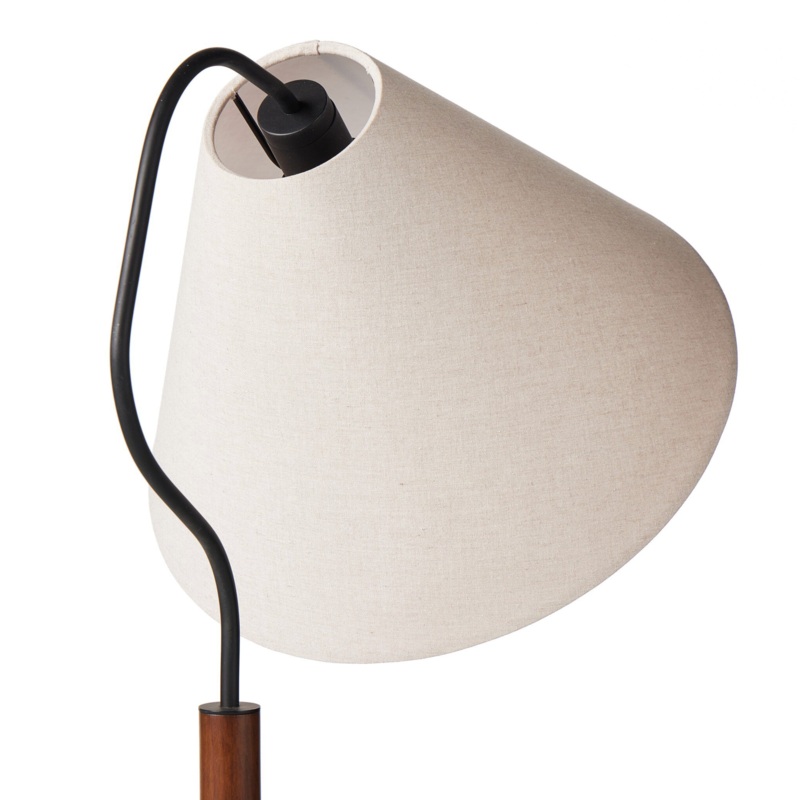 Echoing the utilitarian lines from midcentury task lighting, this versatile floor lamp is made from black powder-coated iron and topped with a natural linen shade for textural contrast.