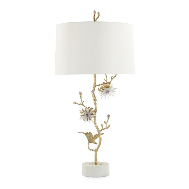 The Jewel Garden Table Lamp represents a stunning marriage of natural motifs and chic modern design. Crafted from brass in a Honey finish, the piece takes the form of an opulent sapling dotted with crystalline flowers of selenite and amethyst. A small bird can also be perched atop the branches, recreated with intricate detail. This three-way turnkey lamp features a round marble base and an organic finial embellished with an amethyst crystal.