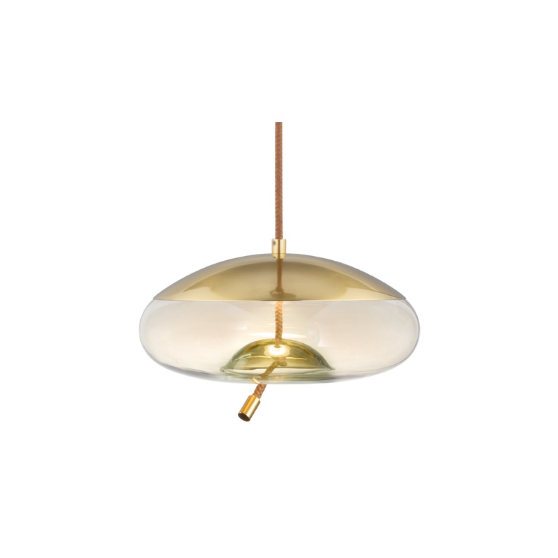 The Geneva Pendant is a beautifully crafted lighting piece that combines traditional glasswork with modern design elements. The glass has a soft amber hue, creating a warm and inviting glow, while the LED light provides energy efficiency. The iron fittings, finished in a brass color, curve elegantly over the top of the pendant, directing the light downward and adding a touch of sophistication.