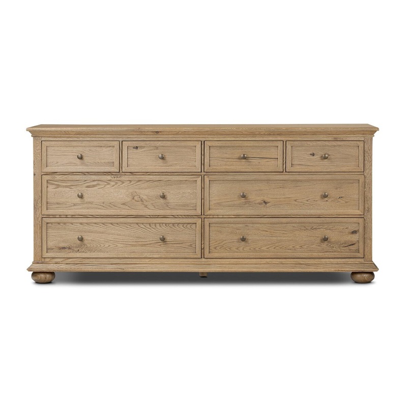 With visible natural graining, smoked black oak and oak veneer speak to the heritage inspiration behind this storage-driven dresser. Intricate molding, bun feet and bronzed iron hardware complete the look. A design collaboration by Amber Lewis and Four Hands. This item has limited online distribution and may not be sold on websites without prior approval. Visit the FAQ page in our Help Center for more details.