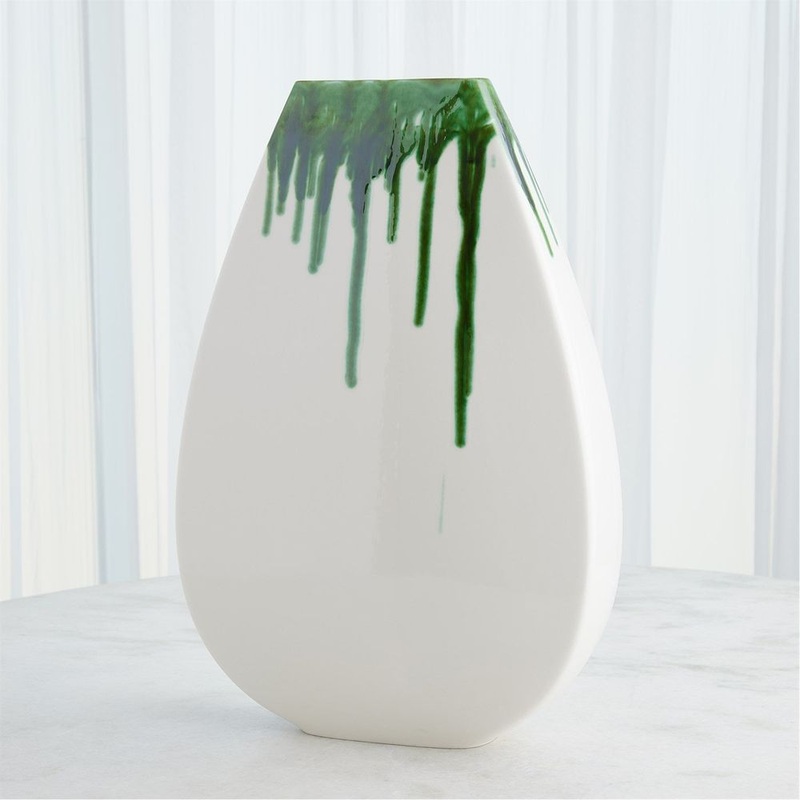 Description: The Giant Teardrop Vases are beautifully handcrafted from Portuguese slip-molded ceramic, adorned with a hand-applied emerald green reactive glaze that creates a beautiful dripping effect.