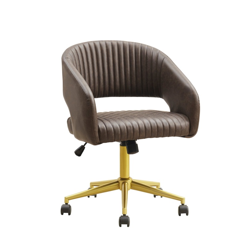 Featuring a sleek panelled design, wraparound armrests, and a padded seat, the Gigi Chair ensures exceptional comfort for working from home. Its adjustable height and smooth-rolling wheels provide functionality, while the gold-toned base adds a luxurious finishing touch. Redefine your office setup with the stylish and comfortable Gigi Chair.