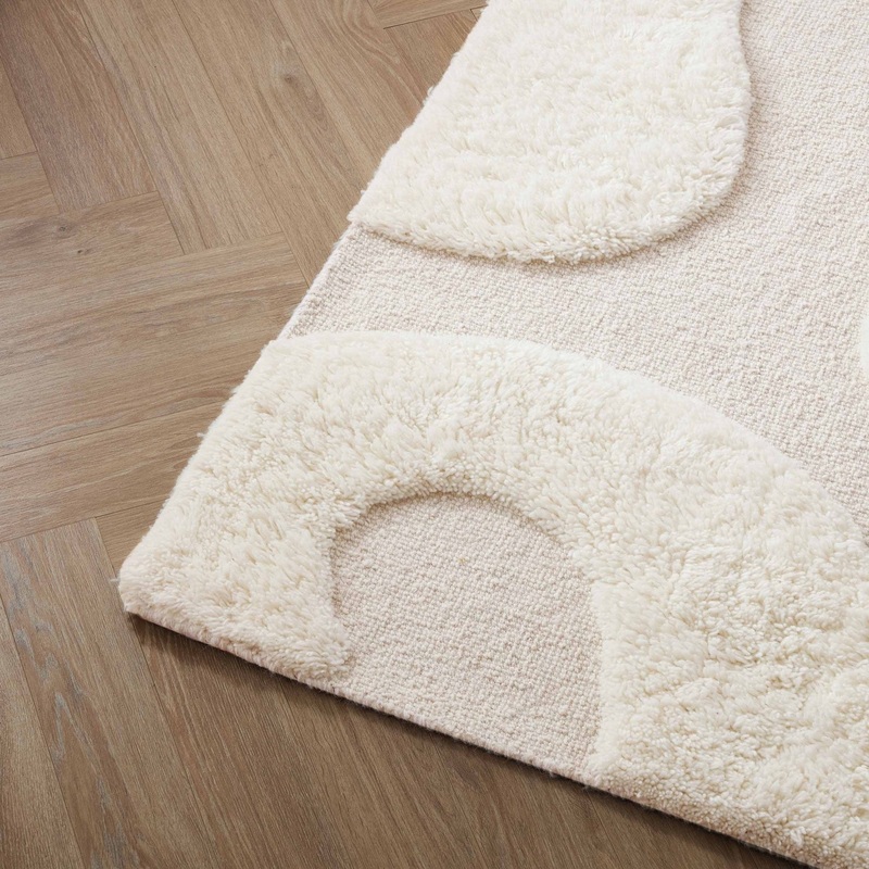 Crafted from 100% wool, this handwoven and over-tufted rug brings bold, raised swirls to a calming off-white base. The layered texture adds dimension and a luxurious feel underfoot, making it the perfect centrepiece for living rooms, bedrooms, or any space that needs a soft, stylish anchor.