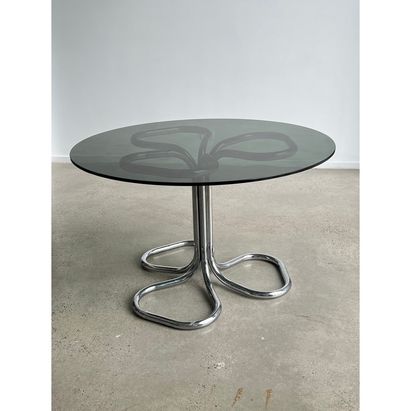 Midcentury chrome base and smoked glass top dining table. This marvellous dining table was designed by Giotto Stoppino in Italy during 1970s. This amazing piece is unique as its complex lines are built just fusing two elements, the chromed base and the smoked glass top. A fantastic item that will be the central element of a midcentury living room.