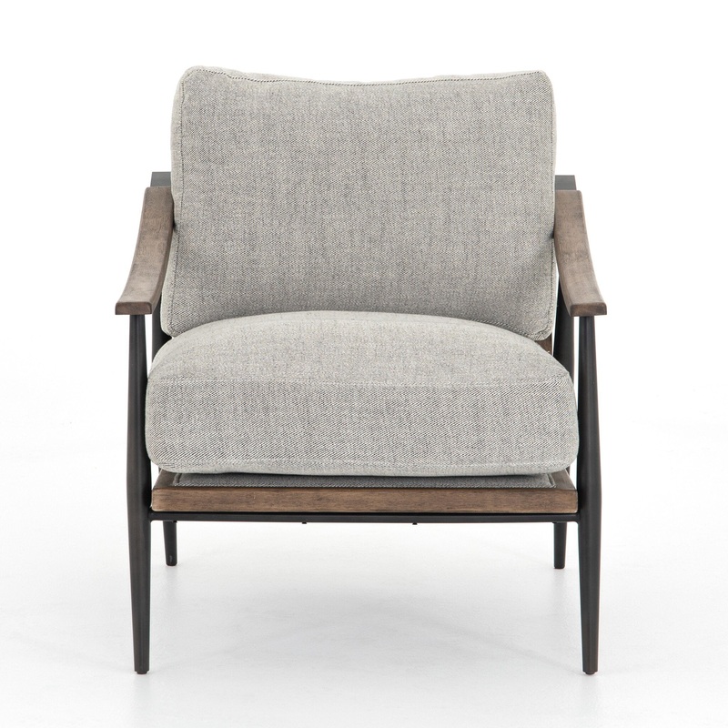 Comfort and class in one chic silhouette. Sloped wooden arms and forged, gunmetal-finished legs frame cushy feather-blend seating covered in a textural grey twill, striking great tonal balance between warm and cool.