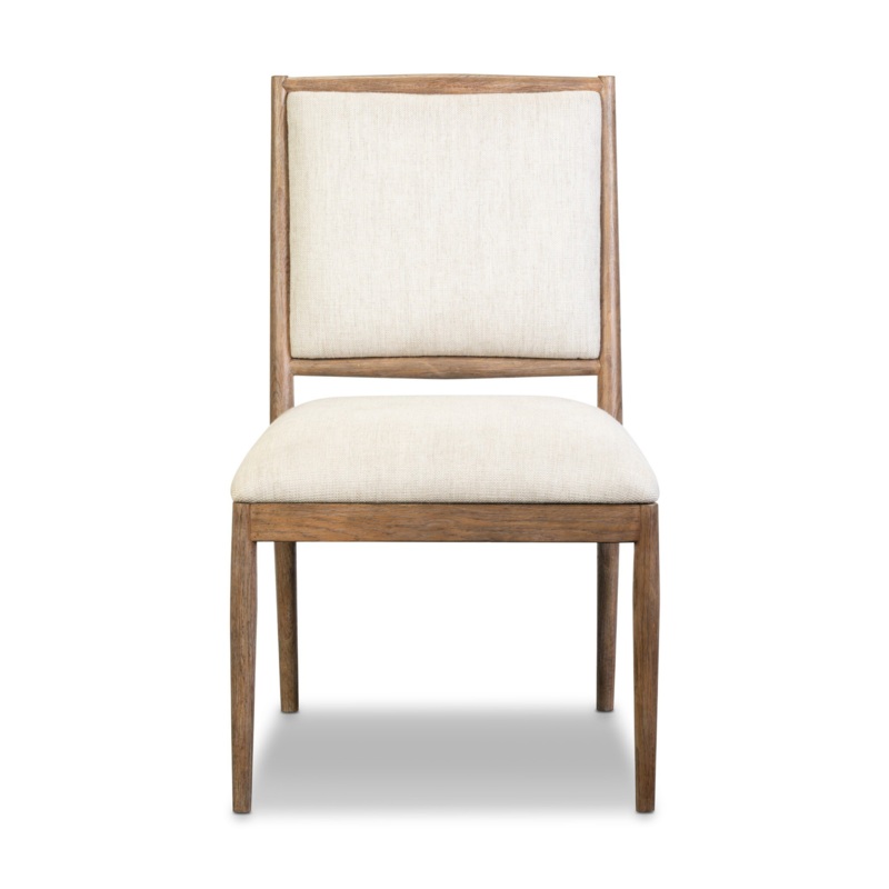 Weathered oak and light, linen-like upholstery fuse for a new take on traditional. Tapered spindle framework complements the clean lines of this dining chair.