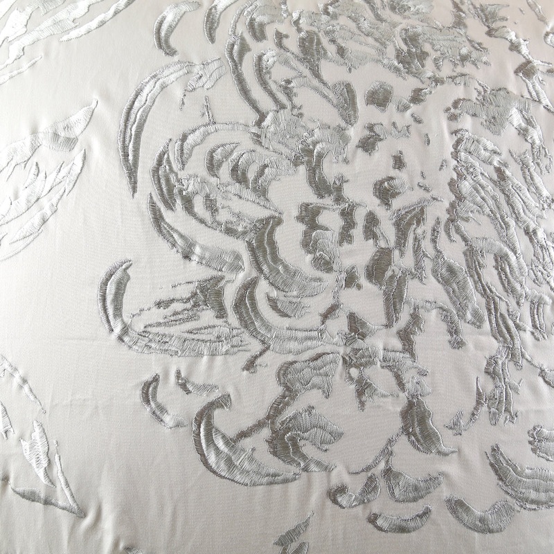 Elegant embroidery in shades and shines of silver on a cream cotton satin ground. Throw reverses to cotton satin, lightly padded.
