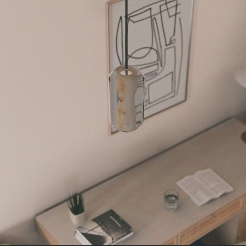 This intriguing pendant lamp will make a sophisticated addition to any modern or contemporary space. Featuring a clear glass shell, what makes this piece shine is the resin diffuser that the shell encases. The resin is allows light to shine through and transform the cool resin to a warm glow when turned on. Since each piece of resin is different every diffuser will have its own unique veining. The light from one standard 60 watt bulb will provide soothing ambient lighting. Available in large or small size.