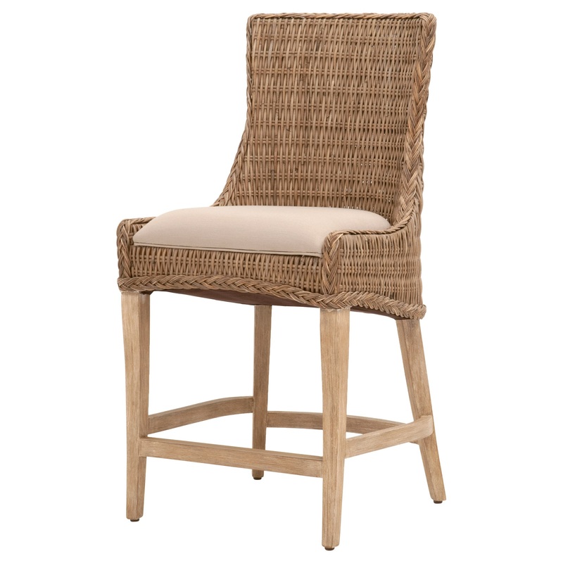 These woven counter stools will add a touch of coastal style to your kitchen, bar or dining room. Constructed with a wood frame and solid mahogany legs, these stools are not only sturdy, but durable. Gray Kubu is tightly woven to create a unique wicker design with braided detailing outlining the seat. The wood legs feature a four-way footrest and are finished with a beautiful Natural Gray. Paired with an upholstered Light Gray seat cushion affixed to the base, the stools provide comfort with style and will be the perfect addition to any transitional or traditional dining room or bar.