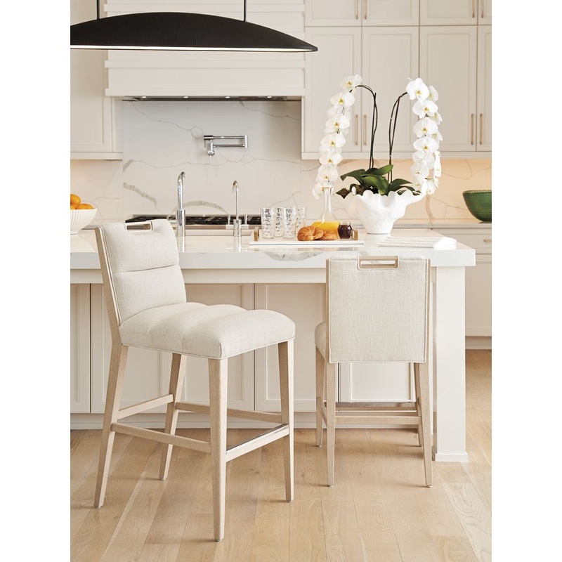 Marketing Copy: Offering a fresh interpretation of relaxed resort living, Sunset Key features clean architectural lines and a raised panel design that creates natural shadowing. White oak surfaces are gently wire-brushed to highlight the grain lines, and finished in a light Sand Drift coloration. Accent materials include ultra-clear wavy glass, honed travertine, and metal elements in a brushed champagne finish for a clean contemporary look.