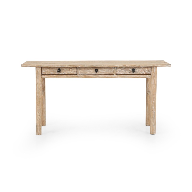 Whitewashed solid reclaimed elm shapes an altar-style writing desk inspired by Chinese antiques. Three pencil drawers feature copper-clad ring pull hardware.