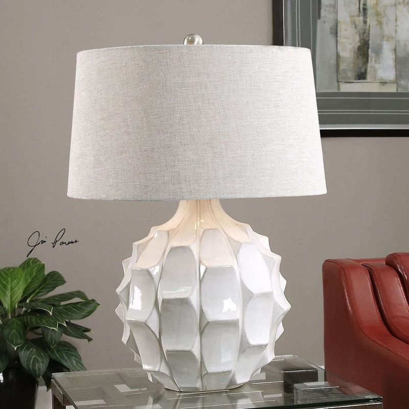 Scalloped Ceramic Base Finished In A Lightly Distressed Gloss White Accented With Plated Brushed Nickel Details. The Slightly Tapered Round Hardback Shade Is A Light Taupe Gray Linen Fabric With Natural Slubbing. Due To The Nature Of Fired Glazes On Ceramic Lamps, Finishes Will Vary Slightly.