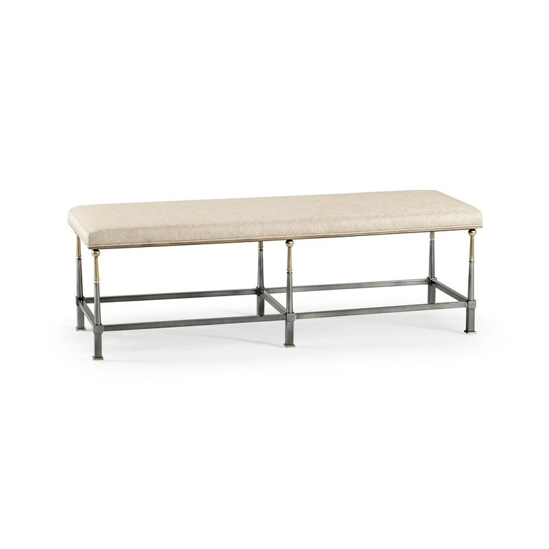 Frame is fabricated from brass and stainless steel with acid dipped, hand rubbed patina. This bench is covered in a Jonathan Charles performance fabric. Upholstered in Skipper (F200).