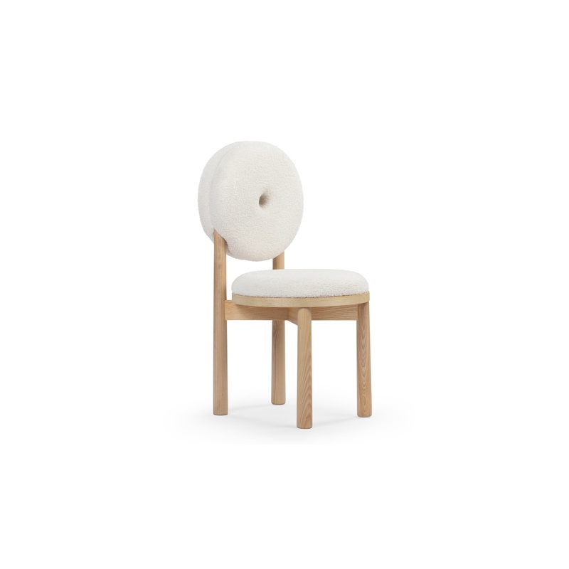 The Hanna Dining Chair offers a stylish yet comfortable seating option for modern homes. Its contemporary design features a unique doughnut-shaped backrest, providing extra support and comfort with its thick padding. The chair is upholstered in warm white boucle, giving it a plush feel while maintaining a clean and minimal aesthetic.