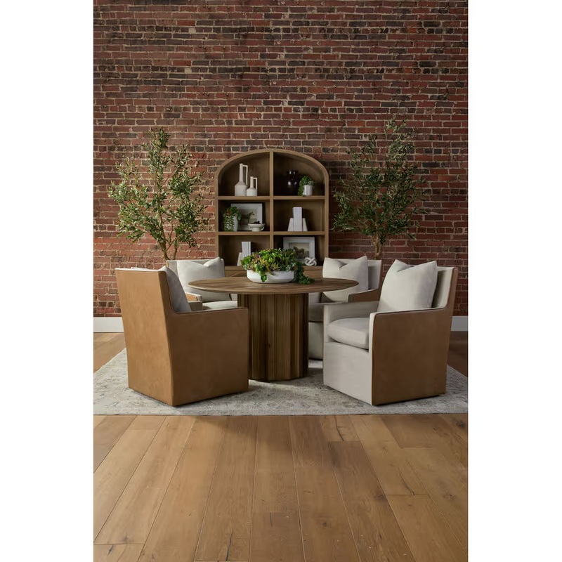 This elegant accent chair combines refined texture with everyday functionality. Featuring a sophisticated two-tone design, it pairs a soft linen-blend front with smooth vegan leather on the back, highlighted by contrast edge piping for a tailored finish. The removable and reversible seat cushion provides lasting comfort, while the included down-filled throw pillow adds an inviting touch. Designed with discreet caster wheels for effortless mobility, this chair blends comfort, style, and versatilityperfect for living rooms, bedrooms, or office spaces.