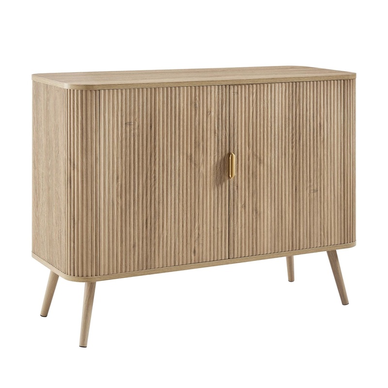 The grooved detailing and sleek finish give it a contemporary edge, while the spacious interior is perfect for storing glassware, bottles, and bar essentials. Its compact design fits seamlessly into smaller spaces, while the top surface provides an ideal spot for showcasing decor or serving drinks.