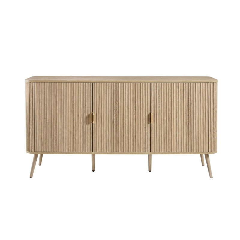 Featuring a sleek grooved design and modern clean lines, the Hattie Sideboard offers ample storage with two spacious cupboards and three central drawers – perfect for organising dinnerware, linens, or everyday essentials. Plus, the top surface provides the ideal space for showcasing your favourite decor pieces.