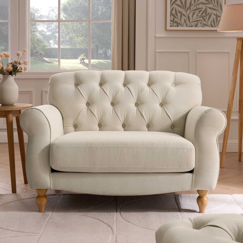 With a stunning button back detail, roll top effect arms and natural wood effect legs, this loveseat is made with a luxurious linen fabric in a warm and subtle shade of cream.
